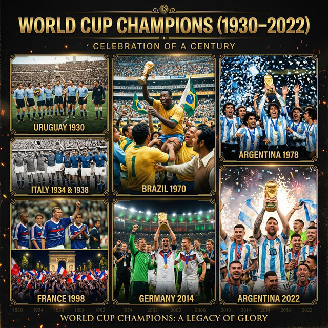 Uruguay won the inaugural 1930 tournament on home soil, defeating Argentina 4–2 in the final. The 1950 Maracanazo — beating host Brazil 2–1 in front of 200,000 fans at the Maracanã — remains the most seismic upset in football history. Uruguay have not reached a World Cup final since, though they reached the semi-finals in 2010.